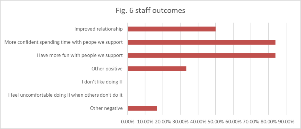 The Intensive Interaction training was tailored to each service, including video of the specific person/people the team supports. Staff feedback gathered after the training indicated that they gained knowledge and confidence in using Intensive Interaction. Also, a follow-up survey 18 months after the start of the pilot showed that colleagues felt that Intensive Interaction had helped them to build relationships with the people they support, and to spend more time, and more enjoyable time, with them (see Fig. 6).