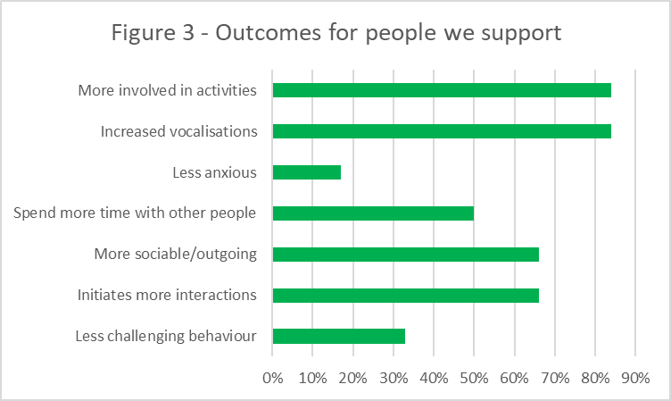Feedback on the outcomes for service users was provided through a series of follow-up calls and by an online survey. The results showed that in the majority of cases, service users became more actively engaged and more communicative, and for others, there was a significant reduction in anxiety and distressed or challenging behaviours (see Fig.3 ).